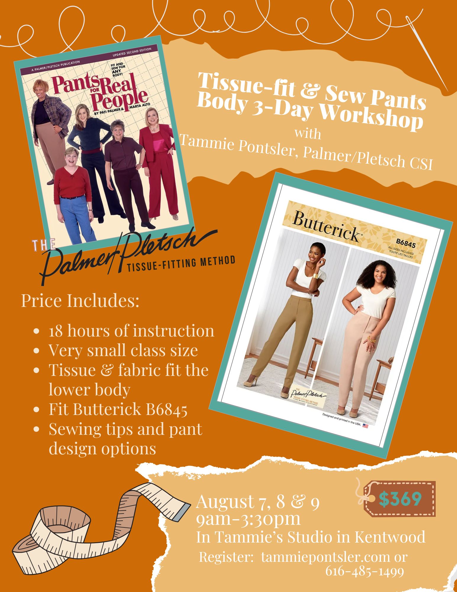 Learn to fit and sew pants with me in my studio! In this 3-day workshop, you’ll learn to tissue-fit pants step by step: choosing your size, preparing, fitting, and altering your pattern. Then we’ll cut and sew your fabric pieces, pin-fit, and finish with construction. The workshop includes 18 hours of instruction. Space is limited to 6 students—a minimum of 4 students is required for the class to run.