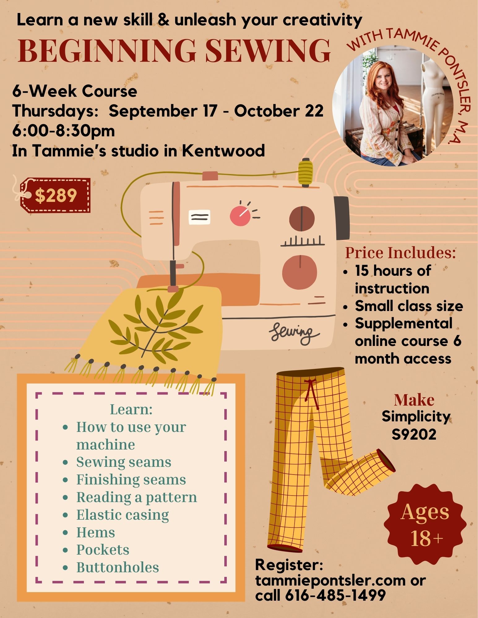 Adult Beginning Sewing! Come learn to sew in my studio. This class is perfect for beginners. No experience necessary!! You will learn how to use your machine, or you may rent one for class use for a low fee. Make a drawstring pant (Simplicity 9202) and learn how to construct pockets, buttonholes, elastic casings and hems. The course includes 15 hours of instruction and the sewing pattern needed for the class. Students will provide materials according to the supply list. Space is limited to 8 students.