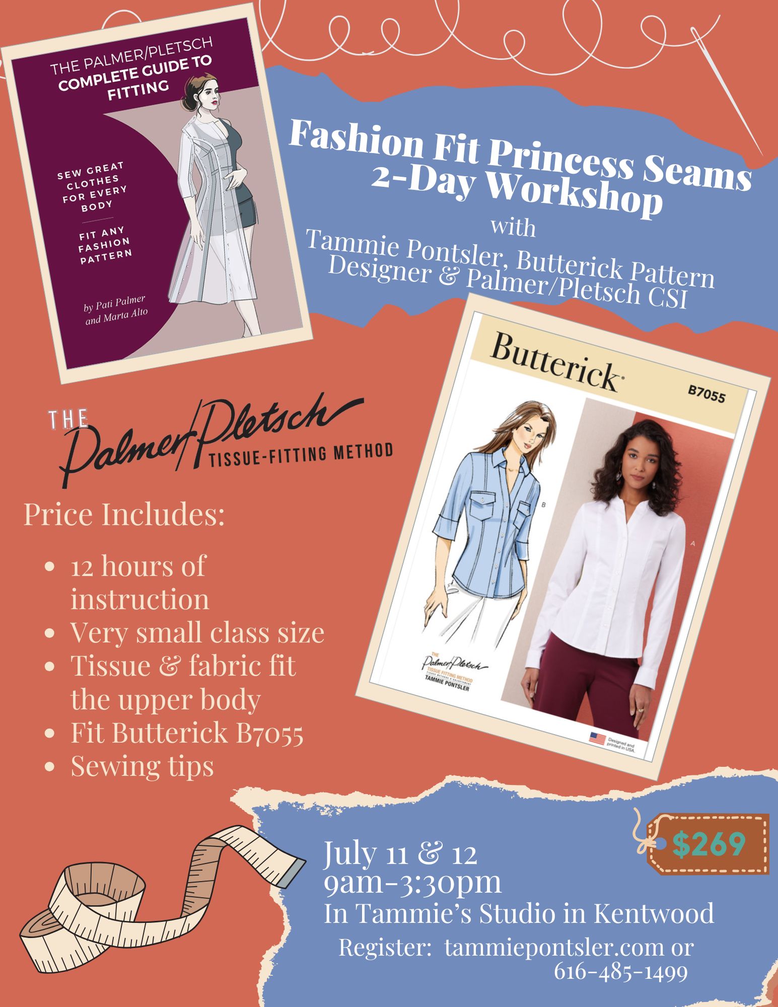 Learn to tissue-fit the upper body using Palmer/Pletsch princess seam shirt pattern Butterick B7055. In this 2-day workshop, you will learn the steps of tissue-fitting princess seams from selecting your size to preparing, fitting and altering your tissue. Then you will cut out your pieces in fabric and pin fit the shirt. No sewing is involved in this 2-day workshop. Workshop includes 12 hours of instruction. The workshop runs 2 consecutive days 9am-3:30pm with homework to be prepared for the second day. Students will provide materials according to the supply list. Space is very limited, so please tell your friends and sign up soon! Please note: the studio is located downstairs in my pet-friendly home (dog and cat).