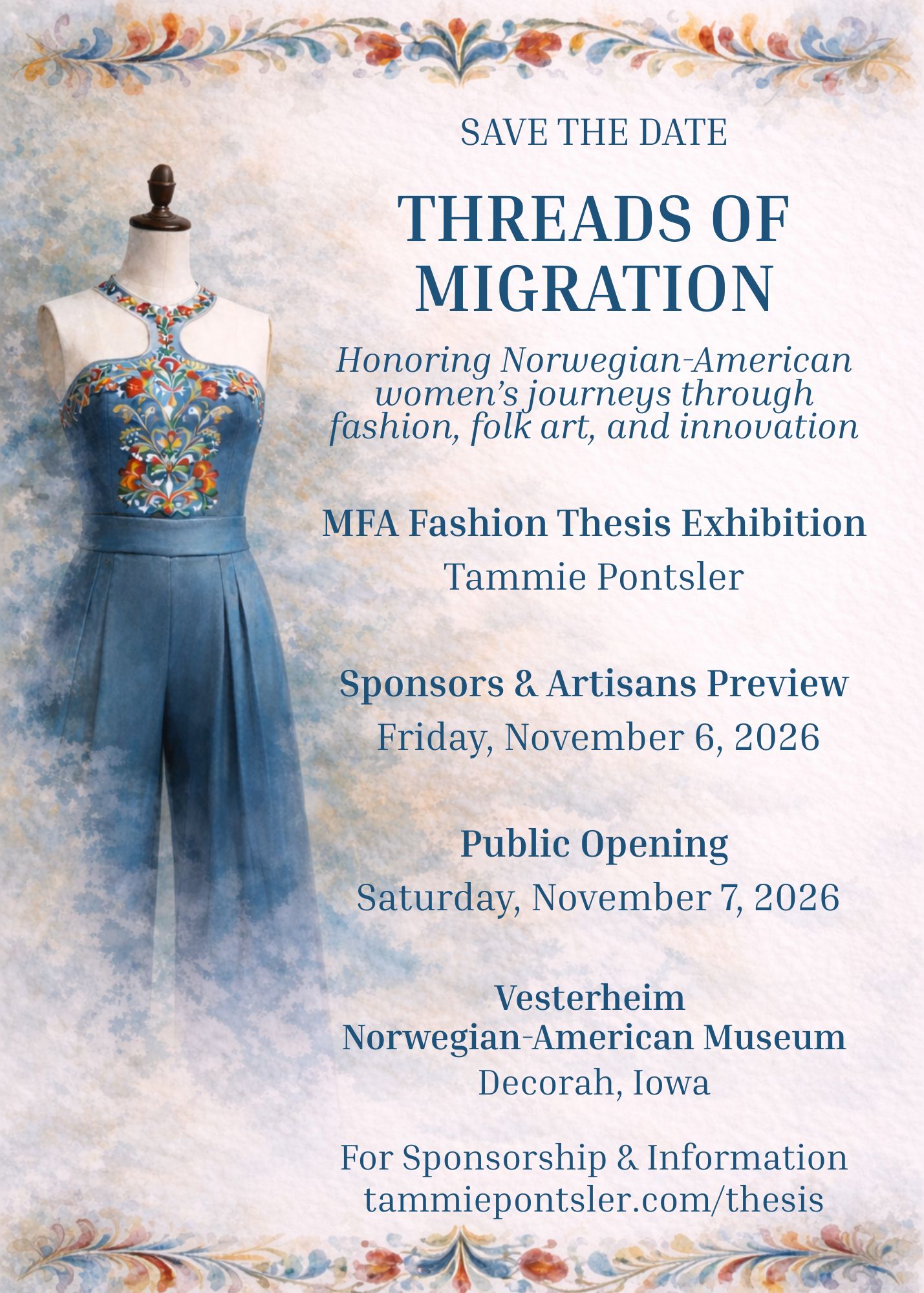 After a twelve-year journey toward completing a lifelong goal of earning an MFA in Fashion, I have begun my thesis process. This page documents the development of my research paper, the design of a contemporary women’s fashion collection, and preparation for the culminating exhibition at Vesterheim Norwegian-American Museum.